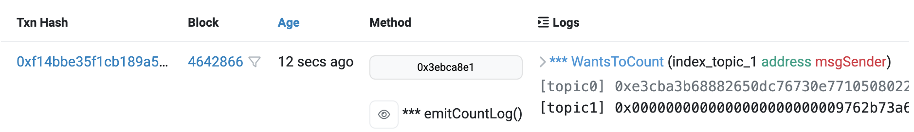 1. Open CountEmitLog.sol in Remix. This contract contains an event WantsToCount that keeps track of the address of the message sender. The function emitCountLog emits this event.